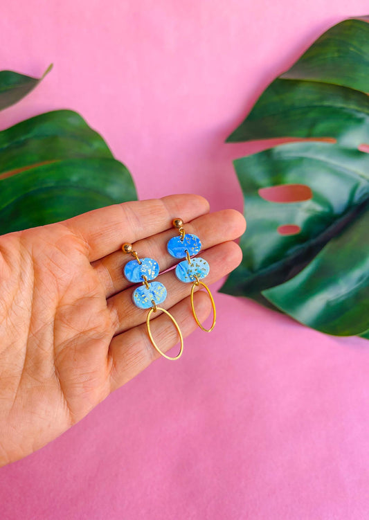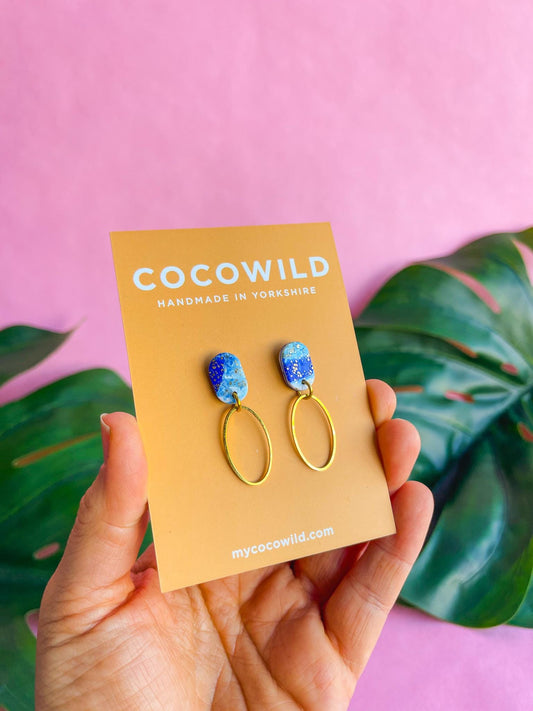 Blue & Gold Round statement stud earrings /Polymer clay oval earrings with gold foil / UK Handmade jewellery // MACKENZIE