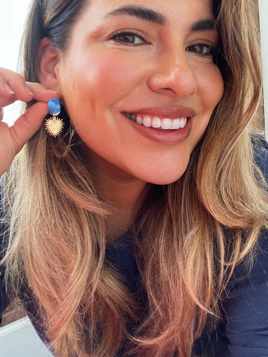 Blue & White Marbled Oval with Gold Heart Charm Earrings // HAVEN