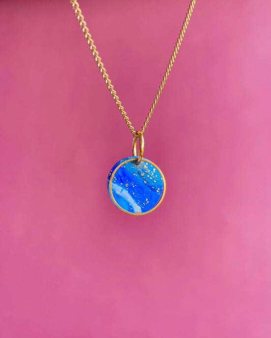 LUCIA - Small Blue and Gold round clay necklace | beautiful marbled blue with gold leaf pendant necklace | 18k gold plated chain // ISABELLA