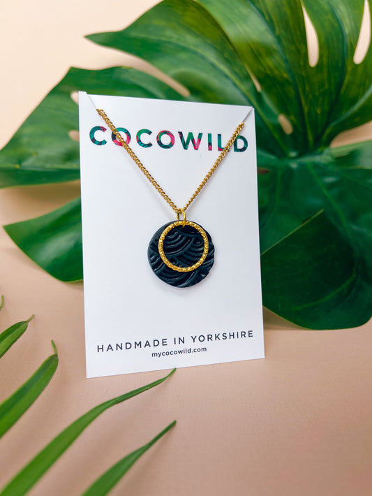 ISLA - Black Wave Large Circle Pendant on Long 18k Gold Chain Necklace