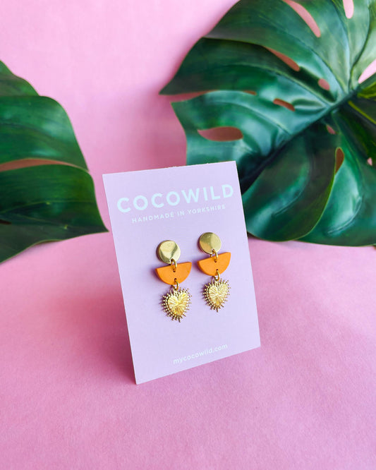 Mustard & Gold Earrings with Gold Heart Charm - ASTRID